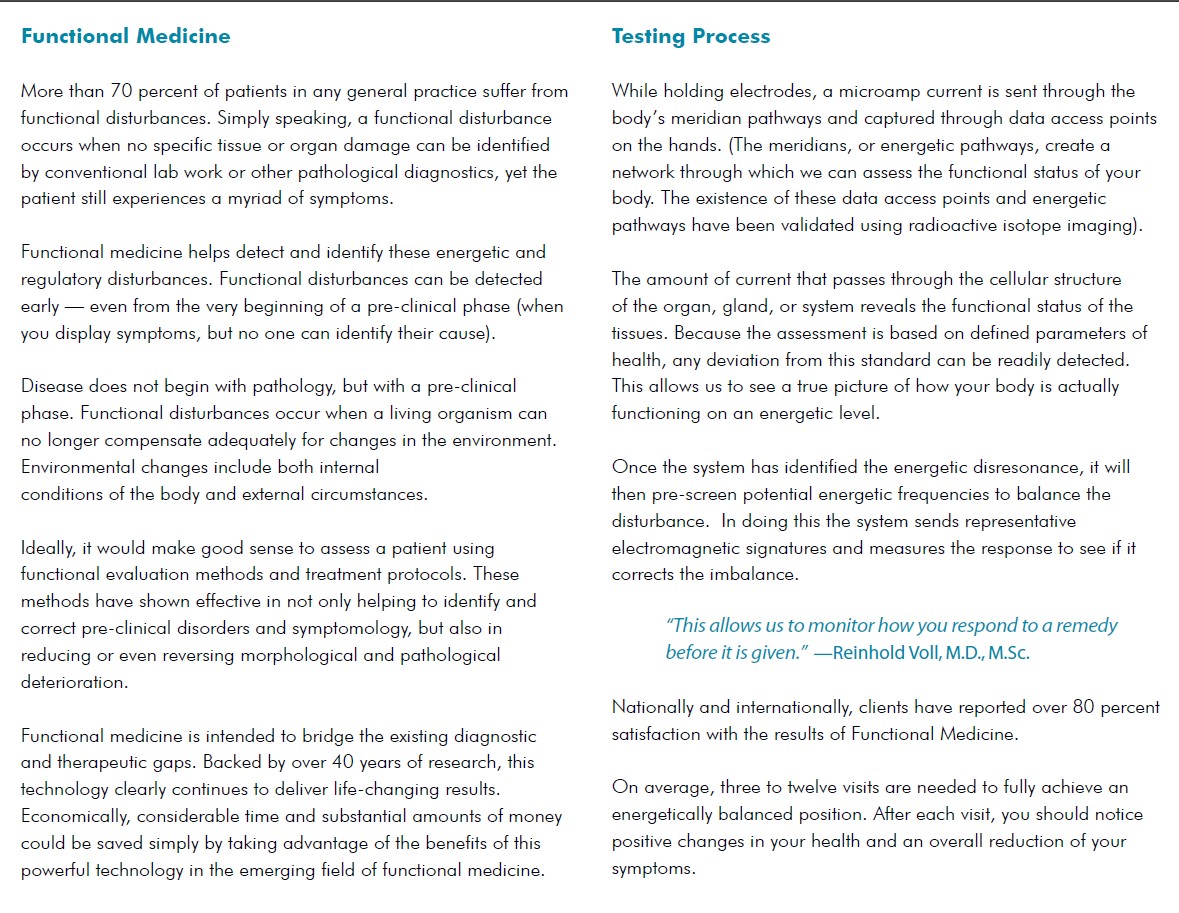 Finds areas of the body out of balance that are affecting the entire system. Starts with your body’s priority towards health.